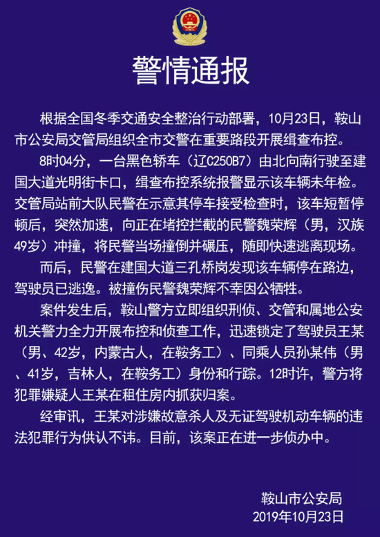 案件发生后,鞍山警方立即组织刑侦、交管和属地公安机关警力全力开展布控和侦查工作,迅速锁定了驾驶员王某(男、42岁,内蒙古人,在鞍务工)、同乘人员孙某伟(男、41岁,吉林人,在鞍务工)身份和行踪。12时许,警方将犯罪嫌疑人王某在租住房内抓获归案。