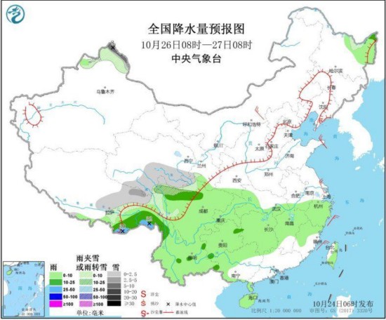 10月26日08时至27日08时,北疆北部山区、西藏东北部、青海东南部等地的部分地区有小到中雪或雨夹雪,局地有大雪。黑龙江东北部、西藏东部、江汉西部、江南大部、西南地区、华南西部、海南岛、台湾岛等地的部分地区有小到中雨,局地大雨(25~32毫米)。内蒙古中部、辽东半岛、山东半岛、江苏中部等地的部分地区有4~6级及以上风(见图6)。