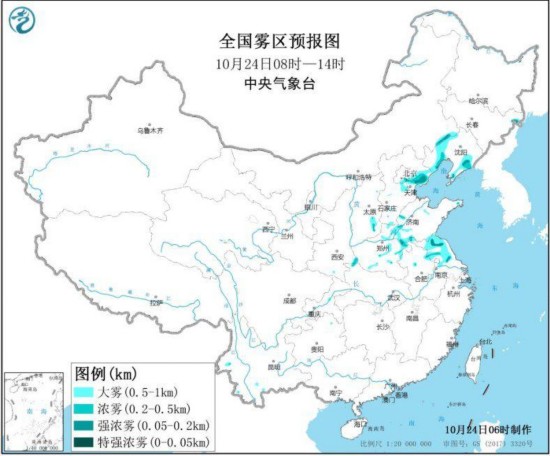 24日早晨至上午,辽宁、河北东北部和西部沿山、北京东南部、天津中北部、山西东南部、山东西南部、河南中东部、江苏中北部、安徽北部等地的部分地区有大雾,局地能见度不足200米,中央气象台于24日06时继续发布大雾预报(见图3)。此外,24日早晨至上午,辽宁中部、华北中南部、黄淮等地仍有轻至中度霾天气。24日下午起,受较强冷空气影响,上述地区雾霾将自北向南减弱消散。