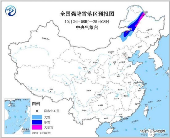 受冷空气影响,预计,10月24日08时至25日08时,内蒙古中部偏北地区和东北部、黑龙江西北部等地的部分地区有大雪,局地暴雪或大暴雪(10~28毫米);上述地区积雪深度将有5~15厘米,局地20厘米以上。中央气象台10月24日06时继续发布暴雪蓝色预警(见图2)。