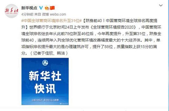世界银行于北京时间24日上午发布《全球营商环境报告2020》,中国营商环境全球排名继去年从此前78位跃至46位后,今年再度提升,升至第31位,跻身全球前40,连续两年入列全球优化营商环境改善幅度最大的十大经济体。其中,单项指标排名提升最大的是办理建筑许可,提升了88位,质量指数上获15分的满分。(记者于佳欣、韩洁)