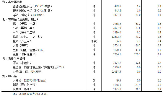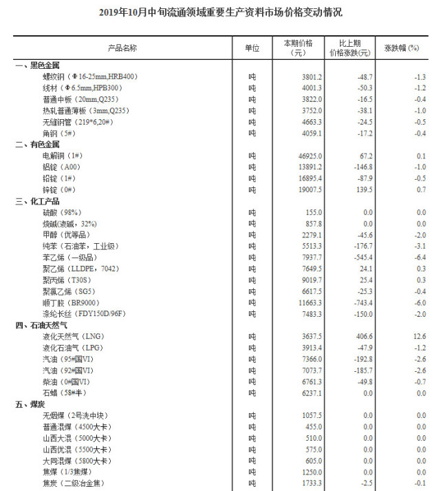 2019年10月中旬流通领域重要生产资料市场价格变动情况