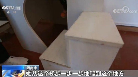 阚南忠:她这个桌子和一般的小孩的桌子是一样的,她的坐凳就不一样了。她的坐凳是专门我给她设计的,她从这个梯步一步一步地爬到这个地方,才能坐到像正常孩子坐得一样。我不可能把这个桌子做得很矮,像这样才是正常小孩坐的这个桌子,她就通过这个凳子一步一步地上去,一步一步地下来,这样她的学习就方便了。
