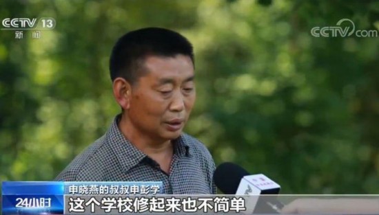 申晓燕的叔叔 申彭学:这个学校修起来也不简单,还是从毛路上,靠人工扛和挑材料上来后,才找人装起来。买的瓦背也背够了。