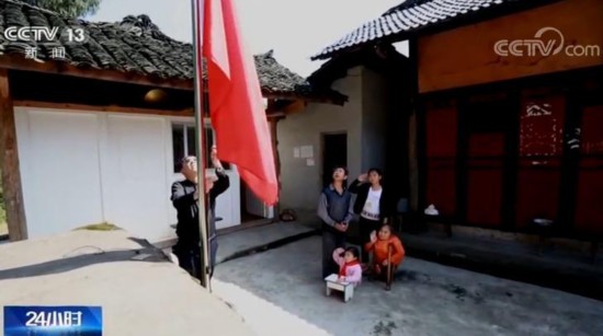 阚南忠:这个旗杆我是从务川——由于(那时)公路不通——用人工一直扛到这个地方的。她姐姐在学校升旗的时候,用手机拍下视频拿给她看,她就很想到那个学校去参加升旗仪式,所以我就给她立这个旗杆;第二层意思,就是我修学校在这个地方,必须有旗杆有旗帜,这是我们修学校的一个标志。