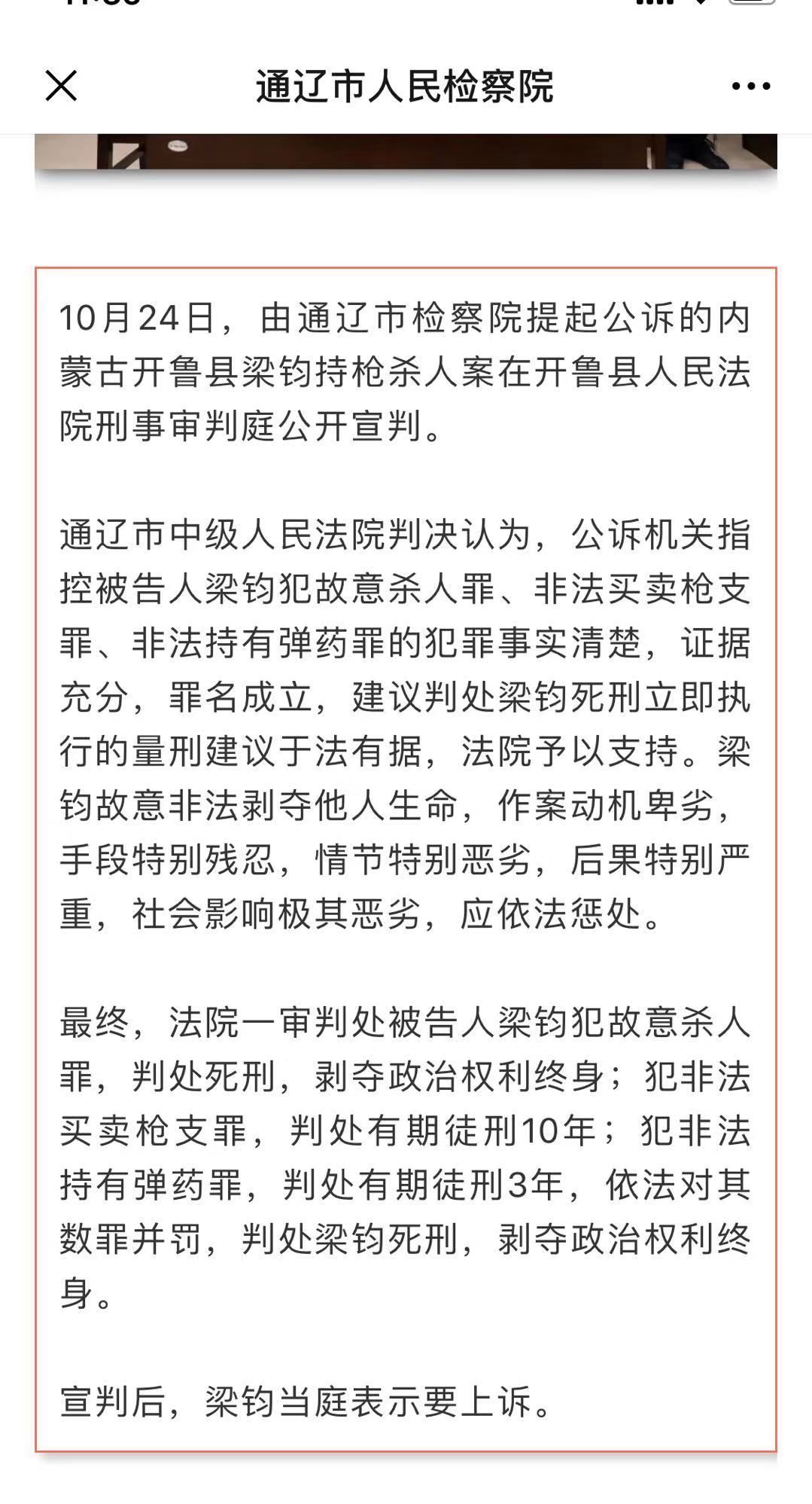 荔枝新闻讯 据内蒙古通辽市人民检察院微信公众号消息,10月24日,由通辽市检察院提起公诉的内蒙古开鲁县梁钧持枪杀人案在开鲁县人民法院刑事审判庭公开宣判。