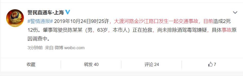 荔枝新闻讯 据上海市公安局官方微博消息,2019年10月24日9时25分许,大渡河路金沙江路口发生一起交通事故,目前造成2死12伤。肇事驾驶员陈某某(男,63岁,本市人)正在抢救,尚未排除酒驾毒驾嫌疑,具体事故原因调查中。 荔枝特报记者正赶往现场。