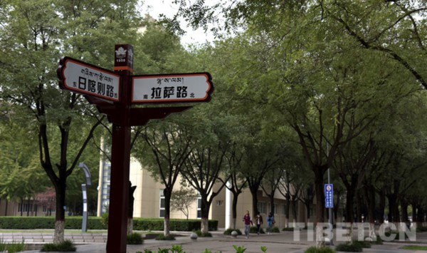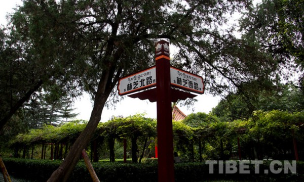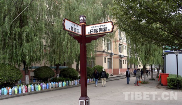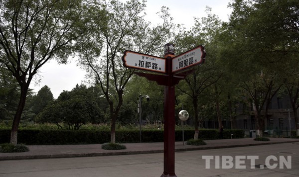 图为西藏民族大学校内路牌,通往拉萨路、日喀则路 摄影:王媛媛