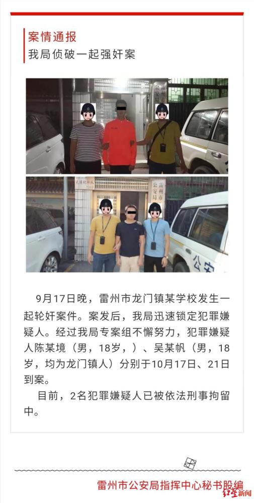 据平安雷州微信公众号,9月17日,广东省雷州市龙门镇某学校发生一起轮奸案件。案发后,雷州市公安局迅速锁定犯罪嫌疑人。两名犯罪嫌疑人陈某境(男,18岁)、吴某帆(男,18岁,均为龙门镇人)分别于10月17日、21日到案。目前,两名犯罪嫌疑人已被依法刑事拘留。