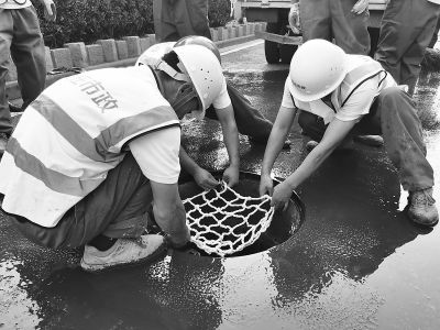 接着,市政工人灌入第二层混凝土。由于使用了新配方水泥,15分钟左右即可硬化。然后再铺设新型冷拌沥青料,使切割区域的路面与周边路面处于同一标高。两名工人抬起井盖,安在井圈座上,并用1个防盗螺栓连接井盖和井圈座。“防盗螺栓是我们自己研发的专利产品,螺栓装上后,井盖仍然可以360°旋转开启,但只有用专有工具才能打开螺栓,有效避免井盖被盗的隐患。”陆海燕说,井盖下方的3处弹簧臂,可以防止井盖跳动以及由跳动产生的噪声。安装的最后一步,是将6个不锈钢登山钩套入防坠落网挂接臂,挂上白色高强度聚乙烯材质的防坠落网。该网承重300公斤以上,有效使用寿命5年以上。