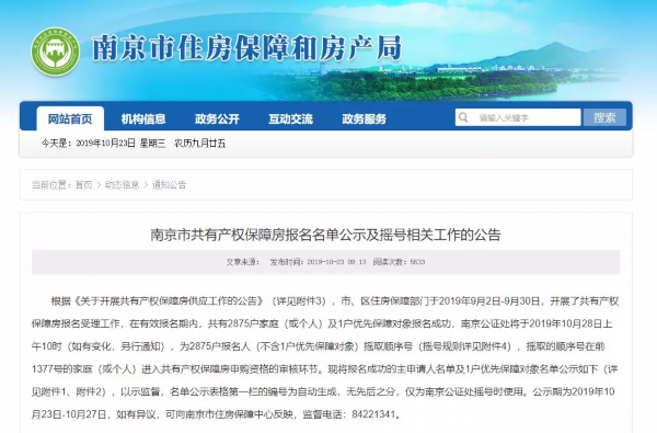 10月23日,南京市住房保障和房产局公布了《南京市共有产权保障房报名名单公示及摇号相关工作的公告》。南京近期开展的1378套共有产权房,在有效报名期内,共有2875户家庭(或个人)及1户优先保障对象报名成功,将于2019年10月28日上午10时为2875户报名人(不含1户优先保障对象)摇取顺序号,摇取的顺序号在前1377号的家庭(或个人)进入共有产权保障房申购资格的审核环节。