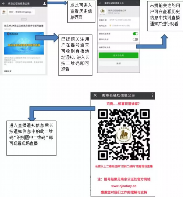 8、摇号全过程进行录像,正式摇号过程在南京公证处官方微博(微博名称:南京公证处http://weibo.com/njnotary2011)、南京公证处官方订阅号(微信搜索:南京公证处信息公示或njgzcgs)及南京公证处官网http://www.njnotary.cn上进行直播。如直播设备发生故障不影响摇号的,现场摇号活动继续进行。