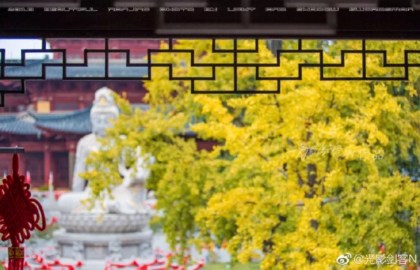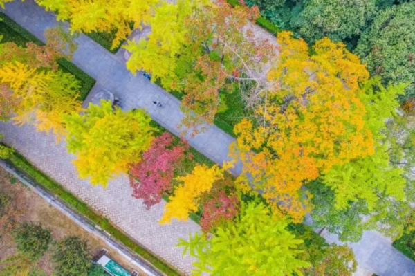 与景区的银杏林相比,校园里的银杏则别有一番情致。有着百年历史底蕴的南京大学鼓楼校区、南京师范大学随园校区里,古朴典雅的校园建筑与高大挺拔的银杏相映成趣。一场秋雨过后,一枚枚银杏叶飘落地面,铺就成绮丽的金色“地毯”。漫步于“地毯”之上,抬头看深秋略显微弱的阳光穿透枝头摇曳的银杏叶,时光好像倒流回许多年前,学生时代的记忆由此扑面而来,正是追忆似水流年的好时节。