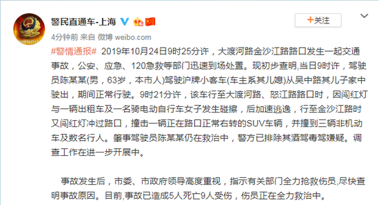 荔枝新闻讯 据上海市公安局官方微博@警民直通车-上海 通报,2019年10月24日9时25分许,大渡河路金沙江路路口发生一起交通事故,公安、应急、120急救等部门迅速到场处置。现初步查明,当日9时许,驾驶员陈某某(男,63岁,本市人)驾驶沪牌小客车(车主系其儿媳)从吴中路其儿子家中驶出,期间正常行驶。9时21分许,该车行至大渡河路、怒江路路口时,因闯红灯与一辆出租车及一名骑电动自行车女子发生碰擦,后加速逃逸,行至金沙江路时又闯红灯冲过路口,撞击一辆正在路口正常右转的SUV车辆,并撞到三辆非机动车及数名行人。肇事驾驶员陈某某仍在救治中,警方已排除其酒驾毒驾嫌疑。调查工作在进一步开展中。