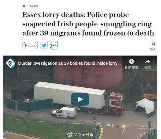 据英国媒体报道,英国警方确认货车内的39具尸体都为中国人后,正在对一个爱尔兰人口贩卖团伙展开调查。