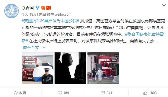 荔枝新闻讯 据联合国官博消息,据报道,英国警方早些时候在该国东南部埃塞克斯郡的一辆厢式货车车厢中发现的39具尸体目前确认全部为中国国籍,死者很可能是“蛇头”非法私运的偷渡者,目前案件仍在紧张调查中。联合国秘书长古特雷斯在社交媒体推特上发表声明,对该事件深表震惊和难过,向所有失去亲人的人们表示最深切的慰问,并强调必须迅速将肇事者绳之以法。