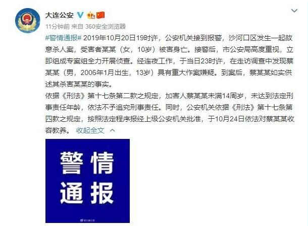 荔枝新闻讯 据@大连公安 通报,2019年10月20日19时许,公安机关接到报警,沙河口区发生一起故意杀人案,受害者某某(女,10岁)被害身亡。接警后,市公安局高度重视,立即组成专案组全力开展侦查。经连夜工作,于当日23时许,在走访调查中发现蔡某某(男,2006年1月出生,13岁)具有重大作案嫌疑。到案后,蔡某某如实供述其杀害某某的事实。