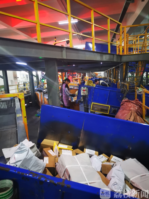 “一些大的容易翻滚的邮件,一些袋装的邮件,需要人工处理。这一块总量在10%左右,其余90%都是机器分拣。”南京邮区中心局调度中心现场调度朱林峻说。