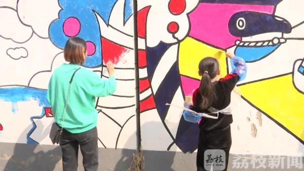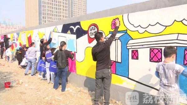 早上8点多,来自无锡惠山区天一实验小学的120多名学生在老师和家长的带领下,来到惠山大道天一路段,共同涂抹五彩墙绘。此次活动一共绘制围墙总长约115米,分23幅图画,每幅图画由5组家庭共同绘制,图画内容不仅包括阳山水蜜桃、惠山庙会等体现城市特色的惠山元素,还有分类垃圾桶、垃圾处理终端等与环保相关的图案。