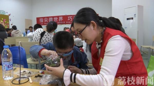 在常州图书馆,近20组家庭齐聚一堂,共同创作微景观生态瓶。经过半小时,各类环保型工具材料、植物、卡通玩偶、沙石等等,就变成了可以攥在手里的绿色"小世界"。在培养孩子动手能力的同时,也推广了绿色环保理念。