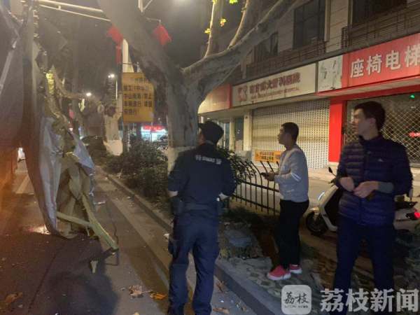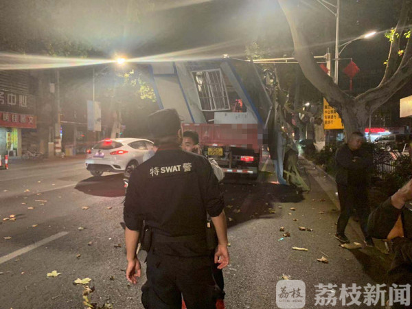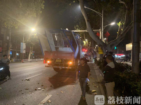 10月23号晚上10点多,南京特警23号车巡逻到升州路时,前方传来一声巨响,一辆厢式大货车停在不远处,厢体严重变形,货物裸露在外。民警迅速赶到,了解到是因为厢体过高,撞上了两旁斜生的梧桐树枝上,路面上到处是撞落的梧桐枝叶,还有货物被撞毁掉落的玻璃渣,虽然货厢被撞坏,所幸没有人员受伤。民警提醒司机设置好警示标志,并且引导来往车辆,防止发生二次事故。