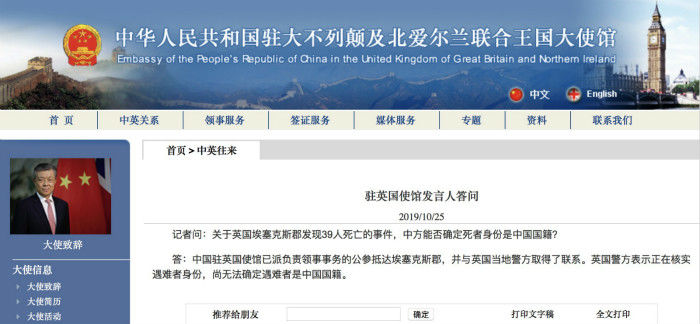 中国驻英大使馆:英警方尚无法确定39人为中国国籍