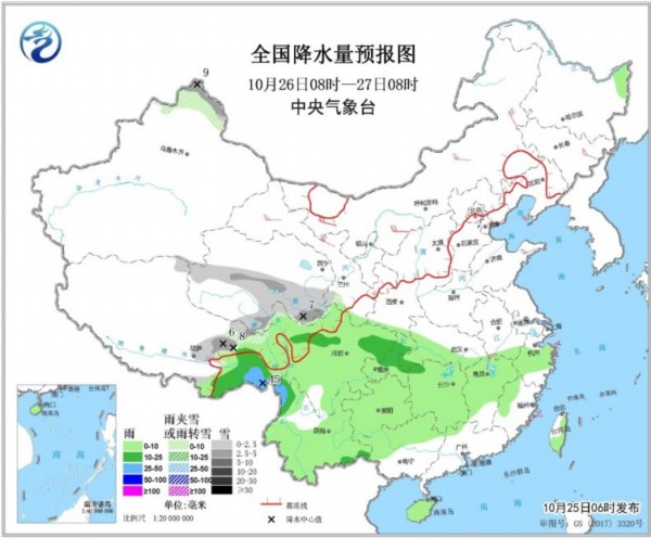 26日08时至27日08时,新疆北疆、青海中南部、西藏东部等地部分地区有小雪或雨夹雪,局地中到大雪。西南地区大部、江南北部和西部、广西北部和海南岛等地部分地区有小到中雨,局地大雨(25~45毫米)。