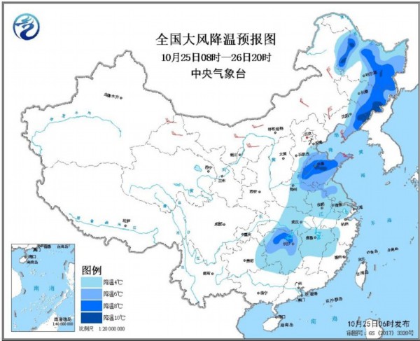预计今天,冷空气继续南下,中央气象台预计,25日08时至26日20时,东北地区大部、华北南部、黄淮、江淮、江汉、湖南、江西中北部等地的部分地区气温将下降4~8℃,其中黑龙江西部和东南部、吉林东南部、辽宁东部等地的局部地区降温可达10℃以上,长江以北的部分地区并伴有4~6级偏北风、阵风7~8级。
