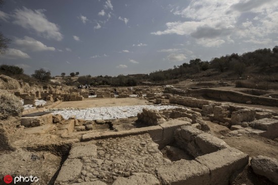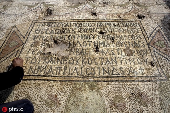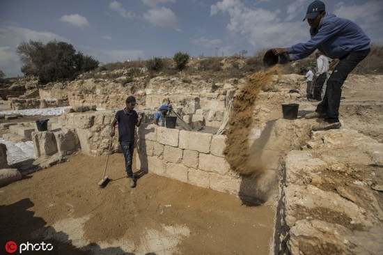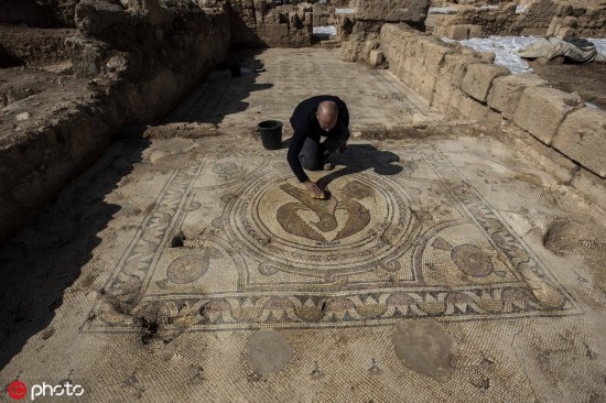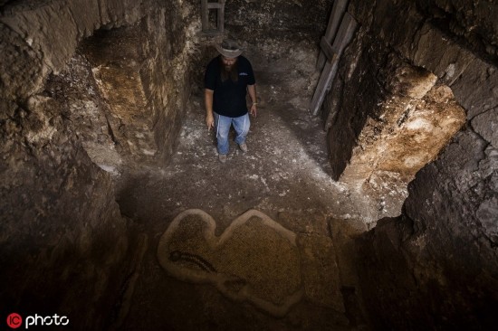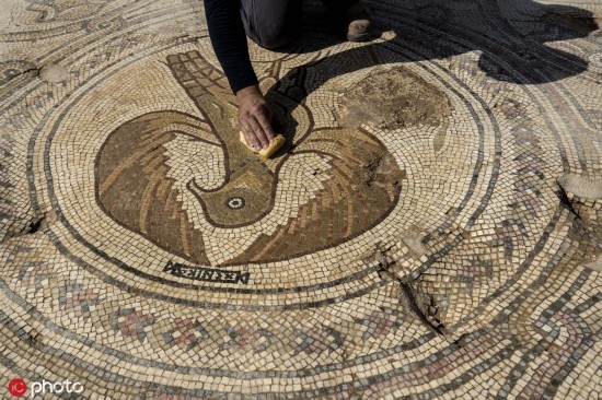[环球网文化频道综合]当地时间2019年10月23日,耶路撒冷区贝特谢梅什,以色列考古学家日前在贝特谢梅什附近发现一座装饰精美的拜占庭式教堂。经过三年的挖掘,以色列古物管理局向媒体公开展示了这座近1500年历史的建筑中的一些珍贵发现,精美的马赛克图案令人惊喜。(图源:东方IC)