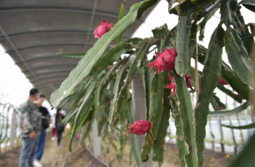 “这果子甜,好看也好吃!”王纯华至今也忘不了三个月前头一回尝到火龙果的滋味,那是吴勒村南果生态产业园结出的第一批火龙果。