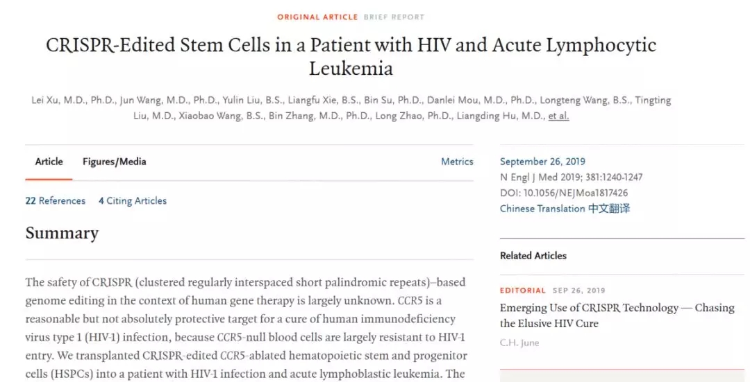 近日,北京大学-清华大学生命科学联合中心邓宏魁研究组、解放军总医院第五医学中心陈虎研究组及首都医科大学附属北京佑安医院吴昊研究组合作,在《新英格兰医学杂志》(The New England Journal of Medicine)发表了题为《利用CRISPR基因编辑的成体造血干细胞在患有艾滋病合并急性淋巴细胞白血病患者中的长期重建》(CRISPR-Edited Stem Cells in a Patient with HIV and Acute Lymphocytic Leukemia)的研究论文,标志着世界首例通过基因编辑干细胞治疗艾滋病和白血病患者的案例由我国科学家完成了!