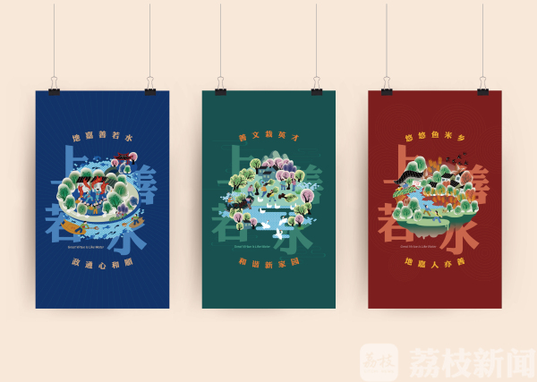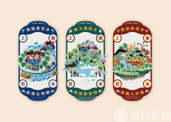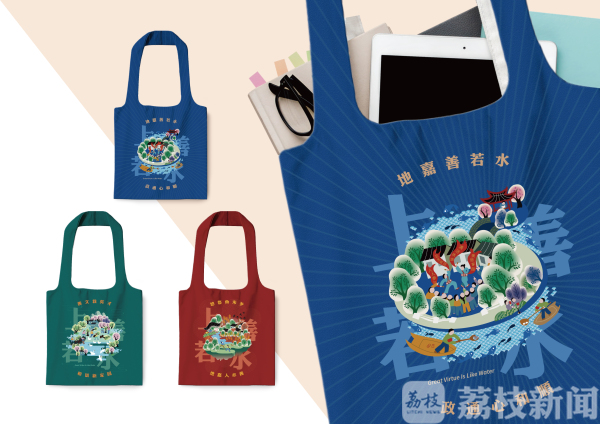 中国美术学院设计艺术学院学生钱佳玲,在为浙江嘉善进行地区形象和创意产品设计时,以“上善若水”为主题,采用环境保护系列的两组农民画《水·生命之源》与《植树植心,善念善行》为设计来源,通过元素提取、分解与重构来组织与设计纹样,传达了知善扬善、与境为善、地嘉人善的设计理念,“用现代化的设计语言来诠释嘉善的文化,三张图都会出现水,我们给它取名字叫‘上善若水’,既体现了嘉善鱼米之乡的人文风情,又体现了‘善’文化的源远流长。”