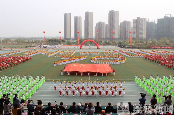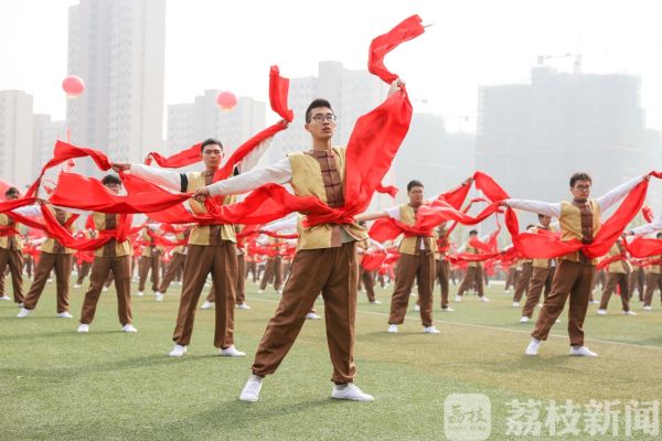前一秒还轻柔舒缓,后一秒便澎湃激昂。踏着“风在吼、马在叫、黄河在咆哮”的激昂旋律,中国药科大学千名“陕北汉子”甩着红绸子从操场两边奔入绿茵场,阵仗整齐,气势如虹。