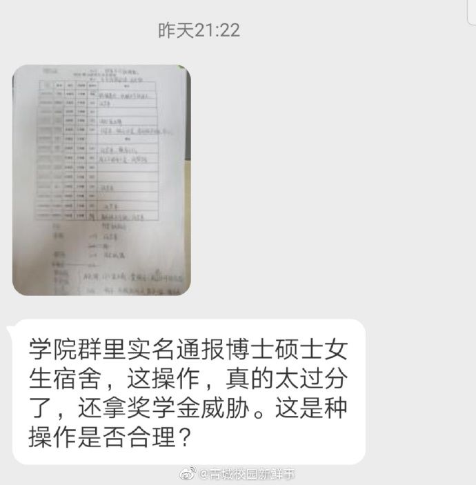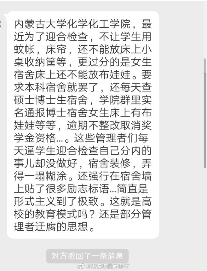 有网友爆料称,内蒙古大学化学化工学院,最近为了迎合检查,不让学生用蚊帐,床帘,还不能放床上小桌收纳筐,还不能放布娃娃。要求本科宿舍就罢了,还每天查硕士博士生宿舍,学院群里实名通报博士宿舍女生床上有布娃娃等,逾期不整改取消奖学金资格。