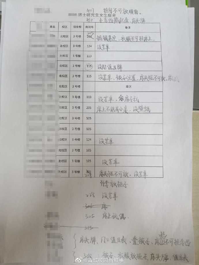 在转发的消息中,还附有一张宿舍通报具体情况表,其中一女生宿舍因床上有布偶“上榜”。