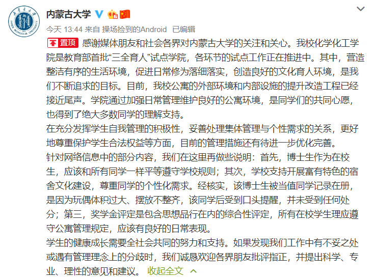 10月26日下午,内蒙古大学官方微博发文回应此事。通报中说明,博士生作为在校生,应该和所有同学一样平等遵守学校规则。经核实,该博士生被当值同学记录在册,是因为玩偶体积过大、摆放不整齐,该同学后受到口头提醒,并未受到任何处分。