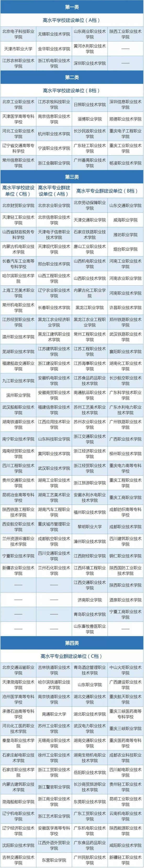 第三类包括:高水平学校建设单位(C档)26所、高水平专业群建设单位(A档)26所、高水平专业群建设单位(B档)59所;