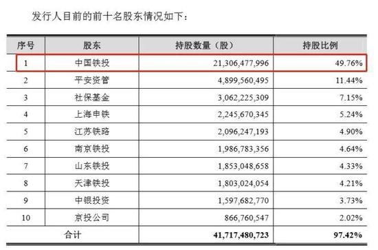 中国铁投持股49.76%为控股股东,国铁集团为实控人。平安资管为第二大股东,持股11.44%,社保基金、上海申铁持股也超5%;此外,江苏铁路、南京铁投、山东铁投、天津铁投、中银投资、京投公司等也位列前十大股东。