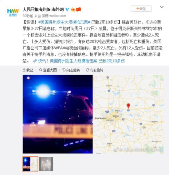综合美联社、《达拉斯早报》27日消息称,当地时间周日(27日)凌晨,位于得克萨斯州格林维尔市的一个校园派对上发生大规模枪击事件。据当地官员和目击者称,至少造成2人死亡、十多人受伤。据初步报告,有多达20名枪击受害者,包括死亡和重伤。美国广播公司下属媒体WFAA电视台报道称,至少2人死亡,另有12人受伤。目前还没有关于枪手的消息,也没有被捕信息。枪手使用的是一把来福枪,其动机尚不清楚。