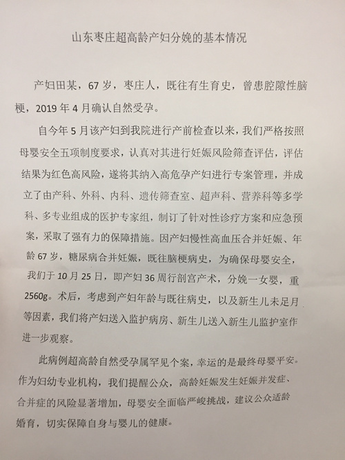 大众网·海报新闻枣庄10月27日讯 27日,枣庄市妇幼保健院就67岁高龄产妇一事发布情况说明称,产妇田某系枣庄人,其既往有生育史,曾患腔隙性脑梗,2019年4月确认自然受孕。