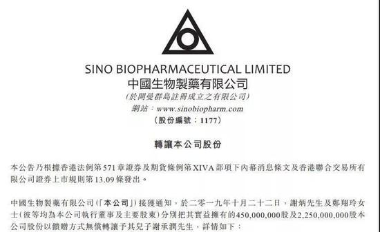10月22日晚间,中国生物制药发布公告称,公司接获通知,执行董事及主要股东谢炳及郑翔玲分别把其实益拥有的4.5亿股及22.5亿股公司股份以馈赠方式无偿转让予其儿子谢承润。转让完成后,谢承润持有该公司合计27亿股,其持股比例达到21.45%。