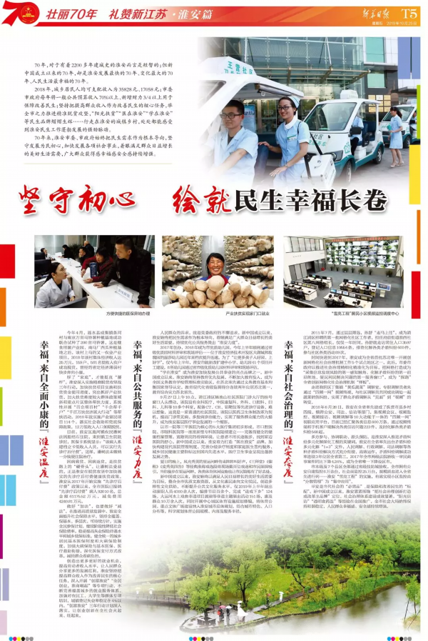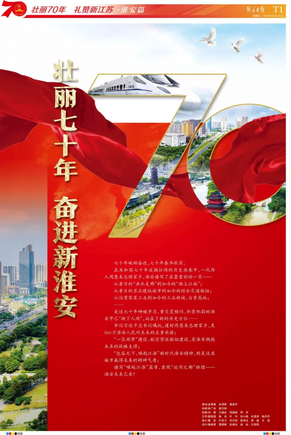 壮阔江淮潮,奋进新时代。《新华日报》10月25日推出“壮丽70年 礼赞新江苏”特刊淮安篇,全面回顾总结淮安70年来特别是改革开放以来取得的巨大成就,全面展现淮安以“牢记总书记嘱托,建好周总理家乡”为引领,抢抓“一区两带一枢纽”建设机遇,加快全面建成小康社会、打造苏北重要中心城市、崛起江淮的生动实践。