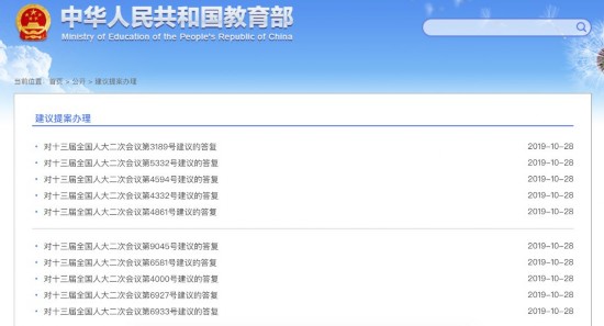 10月28日,教育部官网“建议提案办理”专栏公布了多份对十三届全国人大二次会议建议的答复。