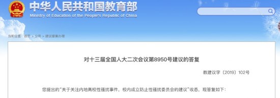 在《对十三届全国人大二次会议第8950号建议的答复》(以下简称《答复》)中,教育部回应了“关于关注内地高校性骚扰事件,校内成立防止性骚扰委员会的建议”。