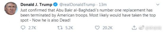 美国总统特朗普刚刚发推说:“刚刚证实,阿布·巴克尔·巴格达迪的头号接班人已经被美军击毙。”不过,特朗普在推文中并未指出巴格达迪的头号接班人是谁,只是表示:“很有可能坐上头把交椅——但现在,他也死了!”