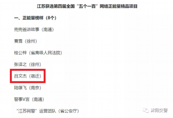 沭阳县公安局交警大队辅警吕文杰从全国2000多名候选人中脱颖而出,荣获第四届全国“五个一百”网络正能量能量榜样!