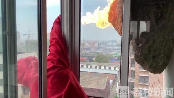 一名消防员穿好防蜂服,在做好防护措施的情况下,利用杀虫剂和打火机将蜂窝的出口引燃,让火和烟气将蜂巢内的马蜂杀死。与此同时,消防员时刻注意着蜂窝的燃烧情况,在火焰接近窗户时,立即用水将火浇灭,防止火焰将整面玻璃烧坏,导致马蜂飞进屋内。随后,消防员利用扫把将剩余的蜂巢捣落。经过约40分钟的紧张处置,整个巨型蜂窝被彻底摘除。