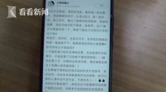 近日,南京栖霞分局刑警大队民警接到市民刘先生和李女士报警,他们和朋友在微信朋友圈购买周杰伦演唱会门票被骗,涉及金额巨大。