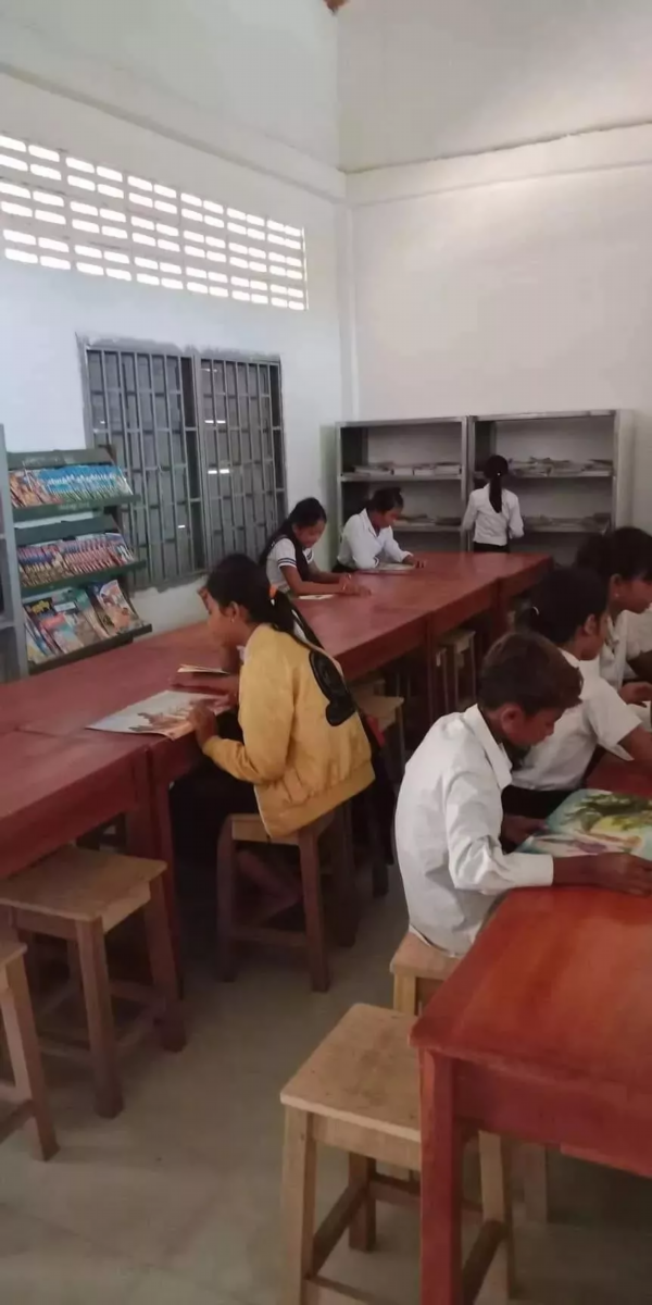 当地柬中友谊公益志愿者联盟接到捐款后,联合西哈努克港经济特区有限公司工程部,克服雨季施工难的问题,立即开展了对学校相关教育设施项目的建设,包括将破旧教室改造成图书室,购买了全新的课桌椅,图书及书架。