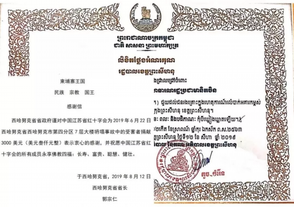 最近,江苏省红十字会收到了一封来自千里之外柬埔寨西哈努克省的感谢信。
